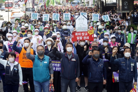 | ¡ã ¹ÎÁÖ³ëÃÑÀÌ 4¿ù 28ÀÏ ¼¿ï Áß±¸ ¼¿ï°í¿ë³ëµ¿Ã» ¾Õ¿¡¼ °áÀÇ´ëȸ¸¦ ¿°í Áß´ëÀçÇØ±â¾÷ó¹ú¹ý Àü¸é Àû¿ë µîÀ» Ã˱¸Çϰí ÀÖ´Ù./»çÁø=´º½Ã½º |