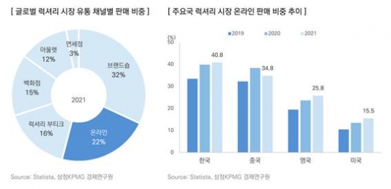 Çѱ¹Àº ¿Â¶óÀÎ ¸íǰ½ÃÀåÀÇ ¼ºÀå¼¼¿¡ À־µ ¼¼°è ÃÖ°í ¼öÁØÀ» »Ë³Â´Ù. »ïÁ¤KPMG¿¡ µû¸£¸é Çѱ¹ ·°¼Å¸® ½ÃÀåÀÇ ¿Â¶óÀÎ ÆÇ¸Å ºñÁßÀº 2021³â 40.8%·Î 2019³â 33.4%¿¡¼ Å©°Ô Áõ°¡Çß´Ù. ±Û·Î¹ú ÃÖ´ë ¿Â¶óÀÎ ·°¼Å¸® Ç÷§Æû ÆÄÆäÄ¡(Farfetch)°¡ ÀÖ´Â ¿µ±¹ÀÌ 25.8%, ¼¼°è ÃÖ´ë ·°¼Å¸® ½ÃÀå ¹Ì±¹ÀÌ 15.5%ÀÎ Á¡¿¡ ºñÇϸé Çѱ¹ÀÇ ¿Â¶óÀÎ ¼ºÀå¼¼´Â µ¶º¸ÀûÀ̾ú´Ù.