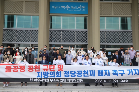| ¡ãÀü³² ¿©¼ö½ÃÀÇȸ ±Ç¼®È¯, ¹®°©ÅÂ, ¼ÛÀçÇâ, ÀÌ»ó¿ì, Á¤°æÃ¶, Á¤±¤Áö, ÁÖÀçÇö ÀÇ¿ø µî 7¸íÀÌ 5¿ù 11ÀÏ ¿©¼ö½Ãû Çö°ü¿¡¼ ±âÀÚȸ°ßÀ» ¿¾î Á¤´ç°øÃµÁ¦ ÆóÁö¸¦ ÁÖÀåÇϰí ÀÖ´Ù./»çÁø=´º½Ã½º |