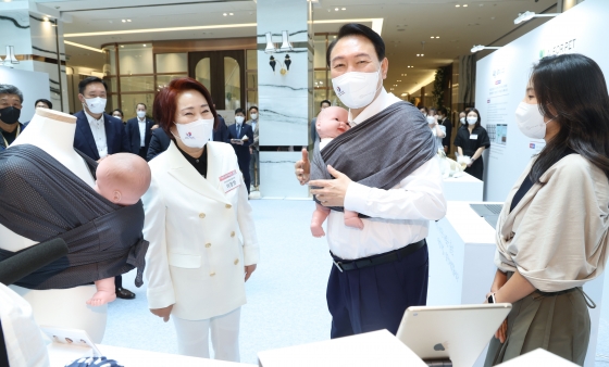 | ¡ã À±¼®¿ ´ëÅë·ÉÀÌ 2022³â 7¿ù 5ÀÏ ¼¿ï ¿©Àǵµ Áß¼Ò±â¾÷Áß¾Óȸ°ü¿¡¼ ¿¸° Á¦1ȸ ¿©¼º±â¾÷ÁÖ°£ ¿©¼º°æÁ¦ÀÎÀÇ ³¯ À¯°øÀÚ Á¤ºÎÆ÷»ó ¼ö¿©½Ä¿¡ ¾Õ¼ À°¾Æ¡¤º¸À° ¾÷üÀÎ ÄڴϹÙÀÌ¿¡¸° ºÎ½º¸¦ ¹æ¹®ÇØ ¾Æ±â¶ì¸¦ Á÷Á¢ Âø¿ëÇØº¸°í ÀÖ´Ù./»çÁø=´º½Ã½º |