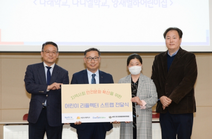 ¼±¾ð½Ä¿¡ À̾î ÁøÇàµÈ ¡®Áö¿ª»çȸ ¾ÈÀü¹°Ç° Àü´Þ½Ä¡¯¿¡¼´Â »ç³» ¾ÈÀüº¸°Ç µ¿¾Æ¸®ÀÎ ¾Èº¸·¦, ºÀ»ç µ¿¾Æ¸®ÀÎ ·¡ÇÁÆ®ÇÚÁî, ÀÓÁ÷¿ø ±âºÎ±ÝÀ¸·Î Á¦ÀÛÇÑ ¾î¸°ÀÌ ¾ÈÀü¿ëǰÀ» KOTRA Àα٠Ư¼öÇб³(¼¿ï ³ª·¡Çб³, ´Ù´Ï¿¤ Çб³) ¹× ¾çÀ纰ÇÏ ¾î¸°ÀÌÁý 3°÷¿¡ Àü´ÞÇß´Ù.