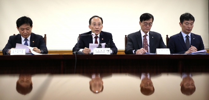 | ¡ã Ãß°æÈ£ ºÎÃѸ® °â ±âȹÀçÁ¤ºÎ Àå°üÀÌ 3¿ù 23ÀÏ ¼¿ï Áß±¸ ÀºÇàȸ°ü¿¡¼ ¿¸° ºñ»ó°Å½Ã°æÁ¦±ÝÀ¶È¸ÀÇ¿¡¼ ¸ðµÎ¹ß¾ðÀ» Çϰí ÀÖ´Ù. ¿ÞÂʺÎÅÍ ±èÁÖÇö ±ÝÀ¶À§¿øÀå, Ãß°æÈ£ ºÎÃѸ®, ÀÌâ¿ë Çѱ¹ÀºÇà ÃÑÀç, À̺¹Çö ±ÝÀ¶°¨µ¶¿øÀå./»çÁø=´º½Ã½º |