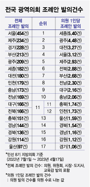 °³º° ÀÇ¿ø ¹ßÀǸ¸À¸·Î ÇÑÁ¤ÇÏ¸é ¼øÀ§°¡ ¹Ù²ï´Ù. 1À§´Â ¼¿ï½ÃÀÇȸ(349°Ç)·Î º¯ÇÔ¾øÁö¸¸ ¡â°æ±âµµÀÇȸ(166°Ç) ¡âÀü³²µµÀÇȸ¡â(140°Ç) ¡âÁ¦ÁÖµµÀÇȸ(132°Ç) ¡âºÎ»ê½ÃÀÇȸ(126°Ç) ¼øÀ¸·Î Á¶·Ê¾ÈÀ» ¸¹ÀÌ ¹ßÀÇÇß´Ù. ÃÖÇÏÀ§´Â ¿ï»ê½ÃÀÇȸ(35°Ç)·Î °°´Ù. ¡â°¿øµµÀÇȸ(55°Ç) ¡âÃæºÏµµÀÇȸ(61°Ç) ¡âÀÎõ½ÃÀÇȸ(69°Ç) ¡â´ë±¸½ÃÀÇȸ(69°Ç)°¡ ÇÏÀ§±Ç¿¡ ÀÖ¾ú´Ù.