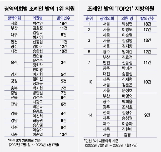 17°³ ±¤¿ª ½Ã¡¤µµ ÀÇȸº° Á¶·Ê¾È ¹ßÀǰǼö´Â Àüü ÀÇ¿ø¼ö°¡ °æ±âµµÀÇȸ(156¸í)¿¡ À̾î 2À§ÀÎ ¼¿ï½ÃÀÇȸ(112¸í)°¡ 454°ÇÀ¸·Î 1À§¸¦ Â÷ÁöÇß´Ù. ÀÇ¿ø °³ÀÎ ¿Ü¿¡µµ »óÀÓÀ§¿øÈ¸, ÁöÀÚüÀå°ú ±³À°°¨ÀÌ ¹ßÀÇÇÑ Á¶·Ê¾Èµµ Æ÷ÇÔµÈ ±âÁØÀÌ´Ù. ÀÌ¾î ¡âÁ¦ÁÖ½ÃÀÇȸ(234°Ç) ¡â°æ±âµµÀÇȸ(228°Ç) ¡âºÎ»ê½ÃÀÇȸ(213°Ç) ¡â±¤ÁÖ½ÃÀÇȸ(209°Ç)°¡ µÚ¸¦ À̾ú´Ù. ÃÖÇÏÀ§´Â ¿ï»ê½ÃÀÇȸ(97°Ç)·Î Áý°èµÆ´Ù. ¡â°¿øµµÀÇȸ(114°Ç) ¡â°æºÏµµÀÇȸ(136°Ç) ¡â°æ³²µµÀÇȸ(144°Ç) ¡âÃæºÏµµÀÇȸ(151°Ç)°¡ ÇÏÀ§±ÇÀ» Çü¼ºÇß´Ù.