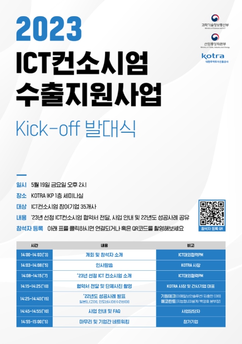ÀÌ´Þ 19ÀÏ °úÇбâ¼úÁ¤º¸Åë½ÅºÎ(Àå°ü ÀÌÁ¾È£)¿Í KOTRA(»çÀå À¯Á¤¿)´Â ¡®2023³â ICT ÄÁ¼Ò½Ã¾ö ¼öÃâÁö¿ø »ç¾÷¡¯ ¹ß´ë½ÄÀ» °³ÃÖÇÑ´Ù. ÀÌ Çà»ç¿¡´Â ¿ÃÇØ Áö¿ø ´ë»óÀ¸·Î ¼±Á¤µÈ ±¹³» ICT ±â¾÷ 35°³»ç°¡ Âü°¡, ¿ÃÇØ »ç¾÷ ÃßÁøÀ» À§ÇÑ ¾÷¹«Çù¾àÀ» ü°áÇϰí, ÄÁ¼Ò½Ã¾ö ÇØ¿ÜÁøÃâ »ç·Ê¸¦ °øÀ¯ÇÑ´Ù.
