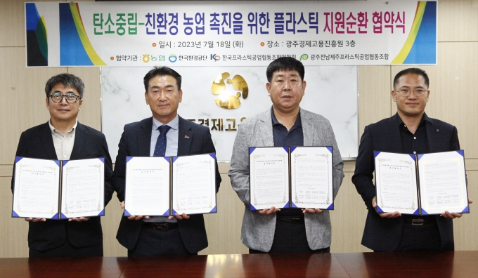 À̹ø ¾÷¹«Çù¾à¿¡´Â ¡®Çѱ¹È¯°æ°ø´Ü ±¤ÁÖÀü³²Á¦ÁÖȯ°æº»ºÎ, ³óÇùÁß¾Óȸ Àü³²º»ºÎ, Çѱ¹ÇÁ¶ó½ºÆ½°ø¾÷Çùµ¿Á¶ÇÕ¿¬ÇÕȸ, ±¤ÁÖÀü³²Á¦ÁÖÇÁ¶ó½ºÆ½°ø¾÷Çùµ¿Á¶ÇÕ¡¯ ÃÑ 4°³ ±â°üÀÌ Âü¿©ÇßÀ¸¸ç °¢ ±â°üÀÇ ±â°üÀå ¹× °ü°èÀÚµéÀÌ Âü¼®ÇÑ °¡¿îµ¥ ±¤ÁÖ°æÁ¦°í¿ëÁøÈï¿ø¿¡¼ Çù¾à½ÄÀÌ °³ÃֵƴÙ.