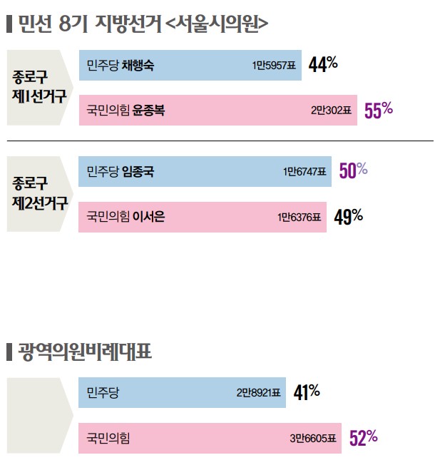 ¡®Ç®»Ñ¸® ¹Î½É¡¯À» ¾Ë ¼ö ÀÖ´Â ½ÃÀÇ¿ø ¼±°Å¿¡¼´Â ±¹¹ÎÀÇÈû°ú ¹ÎÁÖ´çÀÌ °¢°¢ 1¼®¾¿ °¡Á®°¬´Ù. Æò⵿°ú û¿îÈ¿ÀÚµ¿ µîÀÌ ¼ÓÇÑ Á¾·Î±¸ Á¦1¼±°Å±¸¿¡¼´Â ±¹¹ÎÀÇÈû ¼Ò¼Ó À±Á¾º¹ ÀÇ¿øÀÌ, Çýȵ¿°ú â½Åµ¿ÀÌ ¼ÓÇÑ Á¾·Î±¸ Á¦2¼±°Å±¸¿¡¼´Â ¹ÎÁÖ´ç ¼Ò¼Ó ÀÓÁ¾±¹ ÀÇ¿øÀÌ ´ç¼±µÆ´Ù. ¡®Á¤´ç¡¯¸¸ ÅõÇ¥ÇÏ´Â ºñ·Ê´ëÇ¥ ¼±°Å¿¡¼´Â ±¹¹ÎÀÇÈûÀÌ 52%(3¸¸6605Ç¥)¸¦, ¹ÎÁÖ´çÀÌ 41%(2¸¸8921Ç¥)¸¦ ¾ò¾ú´Ù.