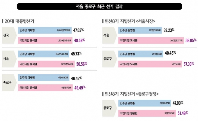 Áö³ ´ëÅë·É ¼±°Å Àü±¹ µæÇ¥À²ÀÇ °æ¿ì À±¼®¿ ´ëÅë·ÉÀÌ 48.56%¸¦, ÀÌ ´ëÇ¥°¡ 47.83%¸¦ ±â·ÏÇØ 1.03%p Â÷À̸¦ ±â·ÏÇÑ ¹Ý¸é Á¾·Î Áö¿ª±¸¿¡¼´Â À± ´ëÅë·ÉÀÌ 49.49%¸¦ ±â·Ï, ÀÌ ´ëÇ¥(46.42%)¿Í 3.07%p Â÷À̸¦ º¸¿´´Ù.