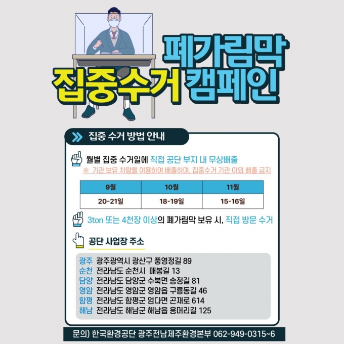 ÀÌ¿¡ °ø´Ü¿¡¼´Â º¸À¯ »ç¾÷Àå ±¤Áֱǿª 1°³¼Ò, Àü³²±Ç¿ª 5°³¼Ò(´ã¾ç, ¼øÃµ, ¿µ¾Ï, ÇÔÆò, ÇØ³²)¸¦ Àӽà °³¹æÇÏ¿© 9¿ù 20-21ÀÏ, 10¿ù 18-19ÀÏ, 11¿ù 15-16ÀÏ·Î 3ȸ¿¡ °ÉÃÄ ¹èÃâµÇ´Â Æó°¡¸²¸·À» ¸ðµÎ ¼ö¿ëÇÒ ¿¹Á¤ÀÌ´Ù.