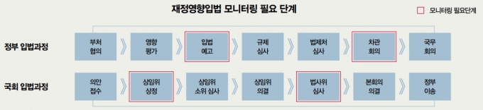 Á¤ºÎ ÀÔ¹ý°úÁ¤¿¡¼´Â °¢ ºÎóÀÇ ÀÔ¹ý¿¹°í ´Ü°è¿Í Â÷°üȸÀÇ ´Ü°è¿¡¼ ÀçÁ¤¿µÇâÀÔ¹ýÀÇ Å¸´ç¼ºÀ» °ËÅäÇÒ ¼ö ÀÖÀ» °ÍÀÌ´Ù. Á¤ºÎ ´Ü°è´Â ±¹È¸º¸´Ù »ó´ëÀûÀ¸·Î º¹ÀâÇÒ ¼ö ÀÖ´Ù. ±× ÀÌÀ¯´Â ±¹°¡ÀçÁ¤ ÃѰý ºÎó´Â ±âȹÀçÁ¤ºÎÀÌÁö¸¸ °¢ ÀçÁ¤¿µÇâÀÔ¹ýÀº °³º° Áß¾ÓºÎóÀÇ ¼Ò°üÀ̱⠶§¹®ÀÌ´Ù. µû¶ó¼ °¢ Áß¾ÓºÎó°¡ ¹ý·ÉÀ» ÀÔ¹ý¿¹°íÇÒ ¶§ ÀçÁ¤¿µÇâÀÔ¹ý ¿©ºÎ¿¡ ´ëÇÑ °ËÅä³»¿ëÀ» Æ÷ÇÔ½ÃŰ´Â ÇÑÆí, ±× °ËÅä³»¿ëÀÌ ±âȹÀçÁ¤ºÎ¿¡ ÀÚµ¿À¸·Î Å뺸°¡ ÀÌ·ç¾îÁú Çʿ䰡 ÀÖ´Ù. ¶ÇÇÑ Á¤ºÎ ÀÔ¹ý´Ü°èÀÇ ¸ð´ÏÅ͸µÀº Â÷°üȸÀÇ ´Ü°è¿¡¼ ÃÖÁ¾ÀûÀ¸·Î °ËÅä, È®Á¤ÇÏ´Â °ÍÀÌ ¹Ù¶÷Á÷ÇÏ´Ù.