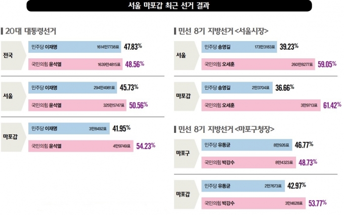¸¶Æ÷°© Áö¿ª±¸´Â °ø´öµ¿, ¾ÆÇöµ¿, µµÈµ¿, ¿ë°µ¿, ´ëÈﵿ, ¿°¸®µ¿, ½Å¼öµ¿ÀÌ ÇØ´çµÈ´Ù. ÀÌ Áö¿ª±¸¿¡¼ À± ´ëÅë·ÉÀº 54.23%(4¸¸9749Ç¥)¸¦ ±â·ÏÇß´Ù. ¹Ý¸é ÀÌ ´ëÇ¥´Â 41.95%·Î, 12.28%p Â÷À̸¦ º¸¿´´Ù. ¼¿ï Àüü¿¡¼ À± ´ëÅë·ÉÀÌ 50.56%, ÀÌ ´ëÇ¥°¡ 45.73%¸¦ °¢°¢ ±â·Ï, 4.83%p Â÷À̸¦ º¸ÀÎ °Í¿¡ ºñÇØ ¹ÌÆ÷°© Áö¿ª±¸¿¡¼ °ÝÂ÷´Â ´õ Å©°Ô ³µ´Ù.