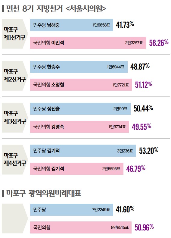¼¿ï½ÃÀÇȸ ÀÇ¿øÀ» »Ì´Â ¼±°Å¿¡¼´Â ¸¶Æ÷±¸ Áö¿ª±¸¿¡¼ ±¹¹ÎÀÇÈû°ú ¹ÎÁÖ´çÀÌ °¢°¢ 2¼®¾¿ °¡Á®°¬´Ù. ƯÈ÷ °ø´öµ¿, ¾ÆÇöµ¿, µµÈµ¿ÀÌ Æ÷ÇÔµÈ ¸¶Æ÷±¸ Á¦1¼±°Å±¸¿¡¼´Â À̹μ® ±¹¹ÎÀÇÈû ½ÃÀÇ¿øÀÌ 58.26%¸¦ ±â·ÏÇÏ¸ç ´ç¼±µÆ´Ù. ¿ë°µ¿, ´ëÈﵿ, ¿°¸®µ¿, ½Å¼öµ¿ÀÌ Æ÷ÇÔµÈ Á¦2¼±°Å±¸¿¡¼´Â ¼Ò¿µÃ¶ ÀÇ¿øÀÌ 51.12%·Î ´ç¼±µÆ´Ù. ¡®Á¤´ç¡¯¸¸ ÅõÇ¥ÇÏ´Â ºñ·Ê´ëÇ¥ ¼±°Å¿¡¼ ¸¶Æ÷±¸ Àüü¿¡¼ ±¹¹ÎÀÇÈûÀÌ 50.94%(8¸¸8515Ç¥)¸¦, ¹ÎÁÖ´çÀº 41.60%(7¸¸2249Ç¥)¸¦ ±â·ÏÇß´Ù.