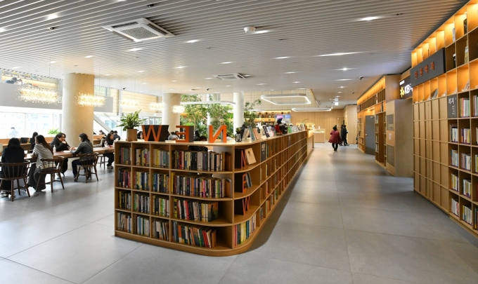 ±¸´Â µ¶¼ °ø°£ ¸¶·Ã¿¡µµ Èû¾²°í ÀÖ´Ù. Áö³ÇØ ±¸Ã»»ç¸¦ ¸®¸ðµ¨¸µÇÏ¸ç ¡®Áö¿ª»çȸÀÇ ¶ó¿îÁö¡¯·Î ²Ù¹Ì±â À§ÇØ °¢º°ÇÑ Á¤¼ºÀ» µéÀÎ °÷Àº ¿¸° µµ¼°ü°ú ºÏÄ«Æä´Ù. ·Îºñ º®¸éÀ» Ã¥²ÉÀ̷ΠȰ¿ëÇØ ¾à 3õ¿© ±ÇÀÇ µµ¼¸¦ ºñÄ¡Çϰí, Áß¾Ó¿¡´Â 9¹ÌÅÍ ±æÀÌÀÇ ¿ø¸ñ Å×À̺í·Î ´ëÇ¥µÇ´Â ¼¼·ÃµÈ ÀÎÅ׸®¾î·Î ºÏÄ«Æä¸¦ Á¶¼ºÇß´Ù. Á÷¿ø»Ó¸¸ ¾Æ´Ï¶ó û»ç¿¡ ¹æ¹®ÇÏ´Â ´©±¸³ª º°µµÀÇ ´ëÃâ ÀýÂ÷ ¾øÀÌ ÀÚÀ¯·Ó°Ô Ã¥À» ÀÐÀ» ¼ö ÀÖ´Ù.