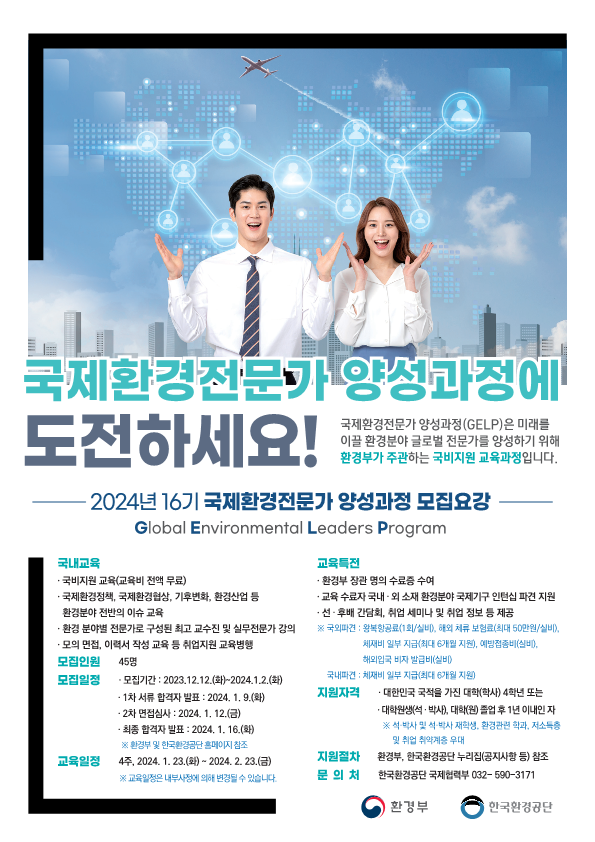 ¡®2024³â ±¹Á¦ ȯ°æÀü¹®°¡ ¾ç¼º°úÁ¤¡¯ Áö¿ø¿¡ ´ëÇÑ ÀÚ¼¼ÇÑ »çÇ×Àº ȯ°æºÎ¿Í Çѱ¹È¯°æ°ø´Ü ´©¸®Áý °Ô½ÃÆÇ¿¡¼ È®ÀÎÇÒ ¼ö ÀÖ´Ù. Áö¿ø¼´Â 2024³â 1¿ù 2ÀÏ È¿äÀÏ 17:00±îÁö Çѱ¹È¯°æ°ø´Ü ±¹Á¦Çù·ÂºÎ À̸ÞÀÏ·Î Á¦ÃâÇÏ¸é µÈ´Ù.