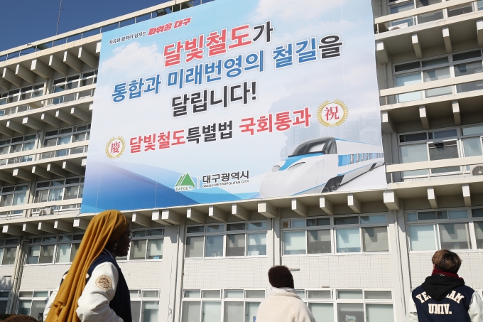 | ¡ãÁö³ 1¿ù 29ÀÏ ´ë±¸ ºÏ±¸ ´ë±¸½Ãû »ê°Ýû»ç ¿Üº®¿¡ ´ë±¸(´Þ±¸¹ú)-±¤ÁÖ(ºû°íÀ»)¸¦ ÀÕ´Â '´Þºûöµµ' Ưº°¹ý ±¹È¸ Åë°ú¸¦ ÃàÇÏÇÏ´Â ´ëÇü Çö¼ö¸·ÀÌ °É·Á ÀÖ´Ù./»çÁø=´º½º1 |