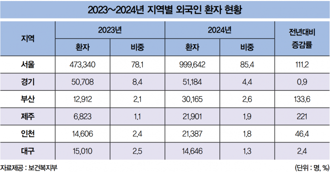 ÇǺΰú, ¼ºÇü¿Ü°ú µî Áø·á ¼ö¿ä°¡ ³ôÀº º´¿øÀÌ ¼¿ï¿¡ ÁýÁߵŠ¿Ü±¹ÀΠȯÀÚ°¡ ¸ô¸° °ÍÀ¸·Î Ç®À̵ȴÙ. ¿Ü±¹ÀÎÀÌ ¹ÞÀº Áø·á°ú¸ñÀº ÇǺΰú°¡ 70¸¸5044¸í(56.6%)À¸·Î °¡Àå ¸¹¾Ò´Ù. ÀÌ´Â Àü³â(23¸¸9060¸í) ´ëºñ ¾à 3¹è °¡±îÀÌ Áõ°¡ÇÑ ¼öÄ¡´Ù. ÀÌ¾î ¼ºÇü¿Ü°ú(14¸¸1845¸í¡¤11.4%), ³»°ú(12¸¸4085¸í¡¤10.0%), °Ç°°ËÁø¼¾ÅÍ(5¸¸5762¸í¡¤4.5%) ¼øÀ¸·Î ³ªÅ¸³µ´Ù.