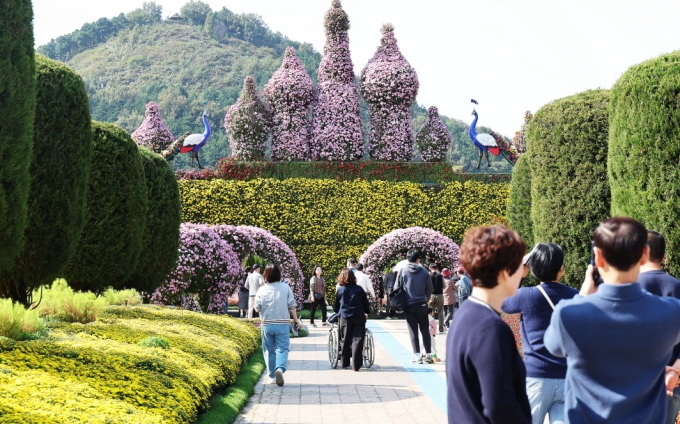 ´ëÇѹα¹ ±¹Çâ´ëÀü¿¡¼ °ü¶÷°´ÀÇ À̸ñÀ» »ç·ÎÀâ´Â °ÍÀº ´ëÇü ±¹È Á¶Çü¹°ÀÌ´Ù. ÃàÁ¦ÀåÀÇ Áß¾Ó±¤Àå¿¡ ³õÀÎ ¡®È¸Àü¸ñ¸¶¡¯(°¡·Î 12m, ³ôÀÌ 10m)¿Í ¡®´ë°ü¶÷Â÷¡¯(°¡·Î 4m, ³ôÀÌ 4m)´Â °Å´ëÇÑ ±Ô¸ð¸¸ÅÀ̳ª ¾ÐµµÀûÀÌ´Ù. ÀÌ ¹Û¿¡µµ ¡®¸¶¹ýÀÇ ¼º¡¯, ¡®Àü½ÃÄÅ¡¯, ¡®»Ç·Î·Î¿Í Ä£±¸µé¡¯, ¡®°ø·æ¡¤µ¿¹° ij¸¯ÅÍÁ¸¡¯ µî ´ë¡¤Áß¡¤¼ÒÇü ±¹È Á¶Çü¹° 95Á¡ÀÌ ¾î¿ì·¯Á® µ¿È ¼Ó ³îÀ̵¿»êÀ» ¿¬»óÄÉ ÇÒ °ÍÀ¸·Î º¸ÀδÙ. ÃàÁ¦ °ü°èÀÚ´Â ¡°ÇüÇü»ö»öÀÇ ±¹È°¡ ¾î¿ì·¯Áø Á¶Çü¹°Àº °ü¶÷°´µéÀÇ ¡®ÀÎÁõ¼¦¡¯ ÄÚ½º·Îµµ ¼Õ»ö¾ø´Ù¡±°í ¼³¸íÇß´Ù.