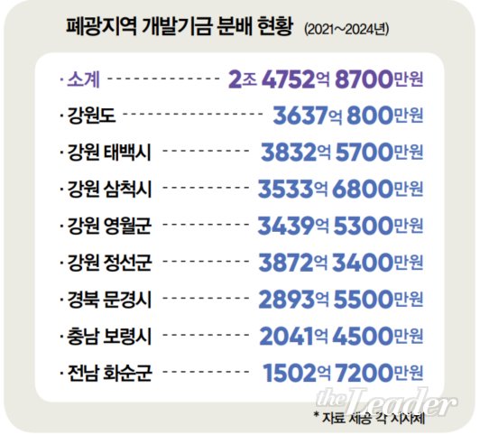 11¿ù °¢ ÁöÀÚü¿¡ µû¸£¸é 2001³âºÎÅÍ 2024³â±îÁö 24³â°£ Àü±¹ Æó±¤Áö¿ª¿¡ ÁýÇàµÈ Æó±¤±â±ÝÀº ¾à 2Á¶4752¾ï¿ø ±Ô¸ð´Ù. ÁöÀÚüº°·Î ¡â°¿øµµ 3637¾ï¿ø ¡âŹé½Ã 3832¾ï¿ø ¡â»ïô½Ã 3533¾ï¿ø ¡â¿µ¿ù±º 3439¾ï¿ø ¡âÁ¤¼±±º 3872¾ï¿ø ¡â°æºÏ ¹®°æ½Ã 2893¾ï¿ø ¡âÃæ³² º¸·É½Ã 2041¾ï¿ø ¡âÀü³² ȼø±º 1502¾ï¿øÀ» ¹èºÐ¹Þ¾Ò´Ù.