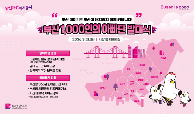 ºÎ»ê½Ã´Â 'ºÎ»ê 100ÀÎÀÇ ¾Æºü´Ü' »ç¾÷À» ¿ÃÇØºÎÅÍ È®´ë ½ÃÇàÇÑ´Ù°í 20ÀÏ ¹àÇû´Ù. ½Ã´Â ±×µ¿¾È ºÎ»ê½Ã À°¾ÆÁ¤Ã¥ºê·£µåÀÎ '´ç½Åó·³ ¾ÖÁöÁßÁö' »ç¾÷ÀÇ ÀÏȯÀ¸·Î 'ºÎ»ê 100ÀÎÀÇ ¾Æºü´Ü'À» ¿î¿µÇØ ¿Ô´Ù. ¾Æºü¿Í Àڳడ ÇÔ²²Çϴ üÇè°ú ¼ÒÅë ÇÁ·Î±×·¥À¸·Î Âü¿© ÀοøÀ» 1000¸íÀ¸·Î È®´ëÇÑ´Ù.